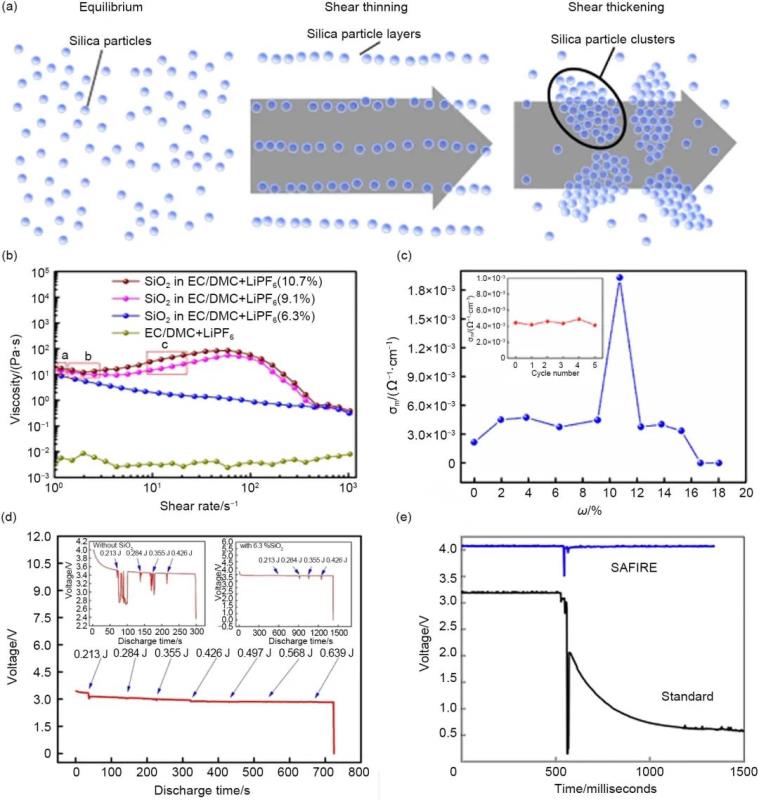 圖8 (a) 不同狀態(tài)下氣相二氧化硅顆粒在液體電解質(zhì)中的分布;(b) 不含SiO2的電解質(zhì)和含有6.3% SiO2、9.1% SiO2和10.7% SiO2的復合電解質(zhì)的流變圖;(c) 室溫下復合電解質(zhì)(SiO2/LiPF6/EC/DMC)離子電導率隨氣相二氧化硅質(zhì)量分數(shù)的變化。插圖為含有9.1% SiO2的復合電解質(zhì)沖擊試驗后的離子電導率;(d) LiFePO4電極在含9.1% SiO2的STF電解液中的放電曲線;(e) 是否使用剪切增稠電解液的電池電壓變化