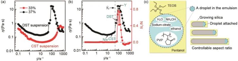 圖7 (a) 不同體積分數(shù)下黏度與剪切速率的關(guān)系;(b) 摻雜物質(zhì)量分數(shù)為37%的懸濁液的黏度和法向力與剪切速率的關(guān)系;(c)以正硅酸乙酯(TEOS),檸檬酸鈉、聚乙烯吡咯烷酮(PVP)、氫氧化銨、乙醇和戊醇為原料,采用乳液法合成了長徑比可控的二氧化硅納米棒