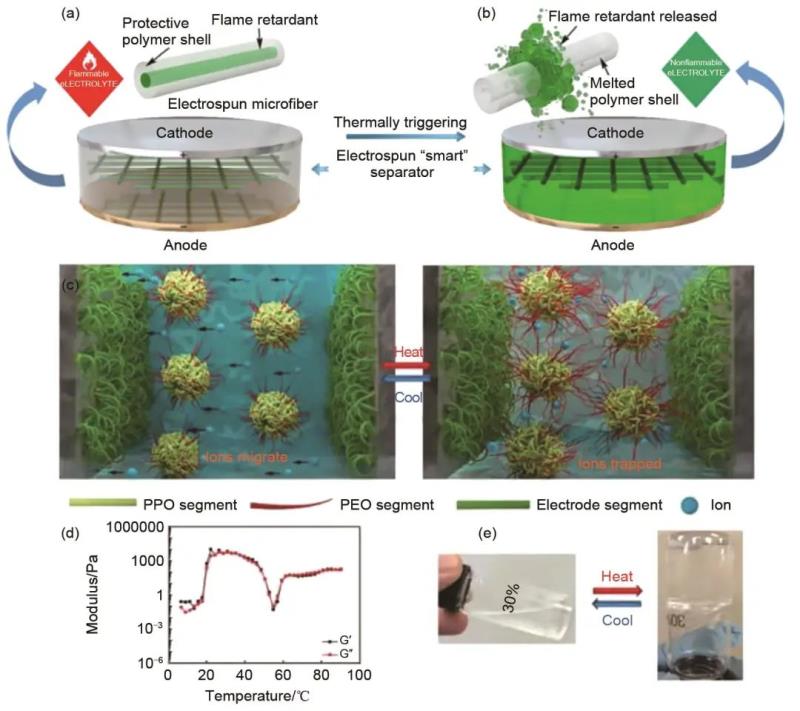 圖5 (a) 由芯殼結(jié)構(gòu)(阻燃劑為芯,聚合物為殼)組成的具有熱觸發(fā)阻燃性能的隔膜示意圖;(b) 熱觸發(fā)后,聚合物外殼熔化,封裝的阻燃劑釋放到電解液中,有效地抑制了電解液的著火和燃燒;(c) 溶膠-凝膠轉(zhuǎn)變示意圖(加熱時熱塑性彈性體溶液由溶膠態(tài)轉(zhuǎn)變?yōu)槟z態(tài),抑制離子的運動,在高溫下主動關(guān)閉設備);(d) 30% Pluronic溶液的流變行為隨溫度的變化;(e) 溶膠和凝膠狀態(tài)下的Pluronic溶液
