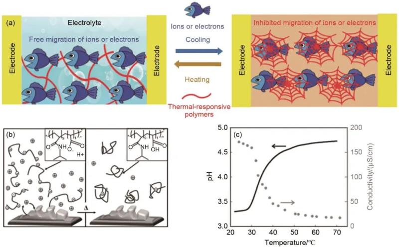 具有熱響應特性的聚合物為防止電池熱失控提供了可行和可逆的策略。當這種熱響應性聚合物用作電解質(zhì)時能夠?qū)囟冗M行響應,溫度升高至超過臨界值后聚合物分子構(gòu)象發(fā)生可逆變化。這種構(gòu)象變化導致聚合物本身的離子電導率降低、鋰電池的電荷轉(zhuǎn)移阻抗增加,從而防止了熱失控的發(fā)生。當溫度降低后,熱敏聚合物可以重新溶解在電解質(zhì)中,恢復其離子導電性,如圖3(a)所示。