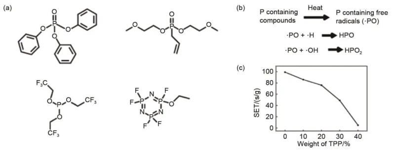 圖2 (a) 阻燃劑的典型分子結(jié)構(gòu);(b) 含磷化合物的阻燃機理;(c) 商用電解液加入磷酸三苯酯(TPP)后自熄時間隨TPP質(zhì)量分數(shù)增加而顯著降低