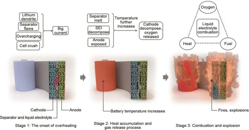 圖1 熱失控過程分為三個階段。第一階段:過熱出現(xiàn)。電池由正常狀態(tài)變?yōu)楫惓顟B(tài),內(nèi)部溫度開始升高;第二階段:熱量聚集和氣體釋放。電池內(nèi)部溫度迅速上升,并發(fā)生放熱反應;第三階段:燃燒與爆炸。易燃的電解液會燃燒,導致火災甚至爆炸