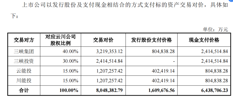 6月30日晚間,長江電力(SH600900,收盤價23.12元,市值5258億元)發(fā)布了購買資產(chǎn)交易報告書,公司擬以發(fā)行股份及支付現(xiàn)金的方式購買三峽集團、三峽投資、云能投、川能投合計持有的三峽金沙江云川水電開發(fā)有限公司(以下簡稱“云川水電”)100%股權,交易作價804.84億元。