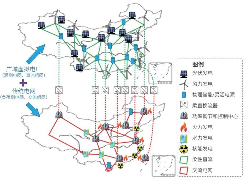 1. 考慮到大量可再生能源按照傳統(tǒng)模式接入現(xiàn)有電網(wǎng)所帶來(lái)的系列挑戰(zhàn),可以構(gòu)建覆蓋一個(gè)全國(guó)范圍內(nèi)統(tǒng)一的柔性直流電網(wǎng),將我國(guó)主要的光伏電站、風(fēng)電場(chǎng)、部分物理儲(chǔ)能電站通過(guò)柔性直流換流器接入該電網(wǎng),以最大程度上利用廣域可再生能源的時(shí)空互補(bǔ)性,從而形成基于可再生能源的廣域源側(cè)電網(wǎng);該源側(cè)電網(wǎng)實(shí)際上也可以視為一個(gè)廣域虛擬電廠。