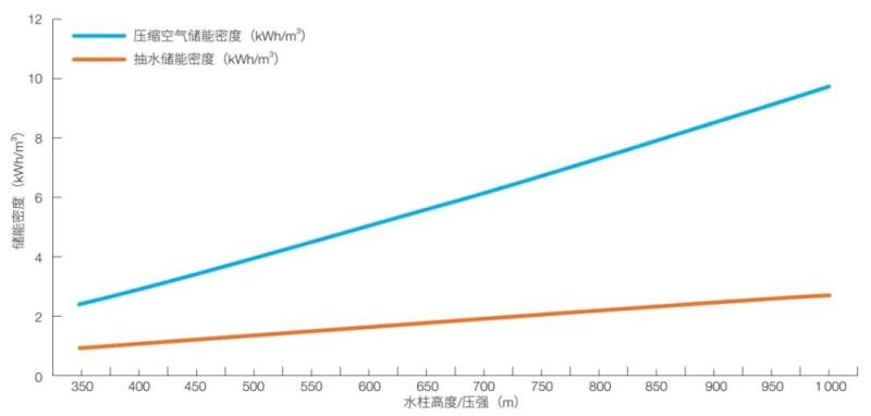 圖 1 抽水儲(chǔ)能與基于水壓補(bǔ)償?shù)膲嚎s空氣儲(chǔ)能系統(tǒng)的能量密度比較