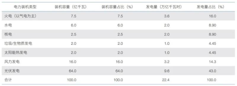 在上述光伏發(fā)電和風(fēng)力發(fā)電總裝機(jī)中,假設(shè)光伏發(fā)電占比 80%(64 億千瓦)、風(fēng)力發(fā)電占比 20%(16 億千瓦),可以得到如表 1 所示的 2060 年我國(guó)電源裝機(jī)及發(fā)電量預(yù)測(cè)表。