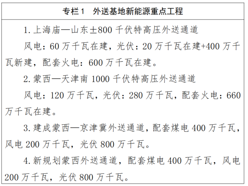加快現(xiàn)有外送通道配套可再生能源項(xiàng)目建設(shè)。圍繞上海廟至山東通道,加快建設(shè)已配套60萬千瓦風(fēng)電、20萬千瓦光伏,“十四五”期間積極爭取增加400萬千瓦光伏;圍繞蒙西至天津南通道,“十四五”期間爭取建設(shè)280萬千瓦光伏、120萬千瓦風(fēng)電。