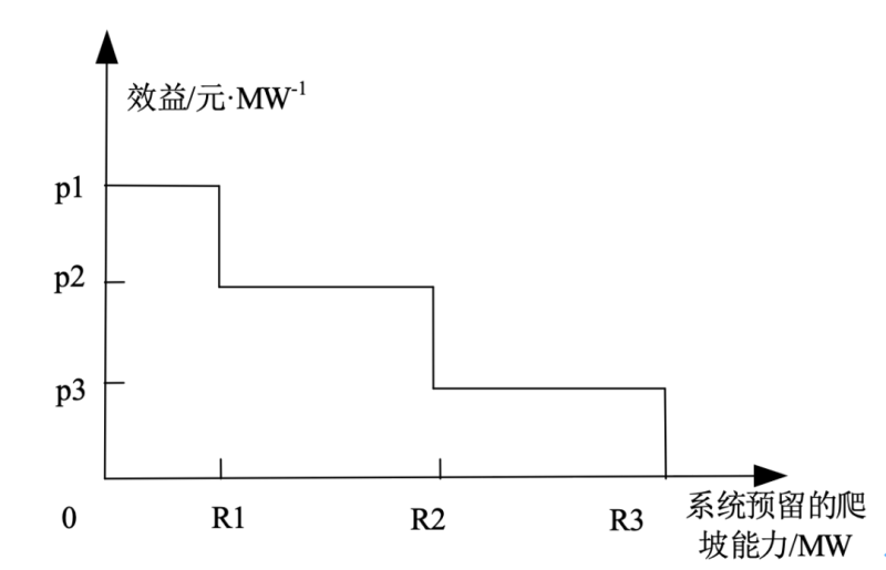 為了在出清模型中綜合考慮爬坡產(chǎn)品帶來的效益和系統(tǒng)發(fā)電成本,CAISO根據(jù)凈負荷波動的概率和失負荷價值提出了分段爬坡效益曲線,如圖4所示。系統(tǒng)出現(xiàn)0-R1的凈負荷較小幅度波動的可能性較大,因此預留的爬坡容量效益也較高。隨著系統(tǒng)預留的爬坡容量增大,其可以應對的凈負荷大幅波動概率也降低,因此產(chǎn)生的效益逐漸減小。