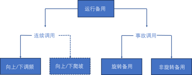 2016年,MISO和CAISO的可再生能源裝機占比分別達到了11.6%和40.5%,發(fā)電占比分別為6.9%和20.9%。同年,兩個市場運營機構(gòu)均建立了爬坡市場。功能上,爬坡產(chǎn)品隸屬于運行備用范疇,與其他輔助服務(wù)的關(guān)系如圖1所示。事故備用通常在出現(xiàn)概率低但影響重大的突發(fā)情況下被調(diào)用,而調(diào)頻和爬坡在正常運行狀態(tài)下被連續(xù)的調(diào)用。調(diào)頻資源通過AGC跟蹤響應實時偏差,而爬坡資源在5-15min內(nèi)根據(jù)調(diào)度指令進行出力,兩者在響應時間、作用方式上存在不同。
