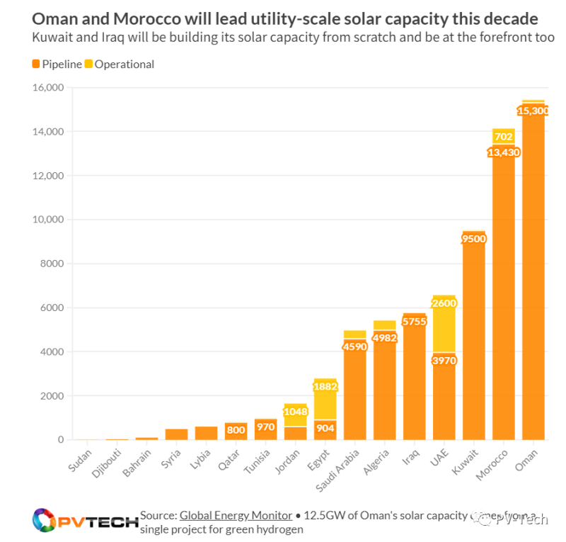 阿曼、摩洛哥和科威特公布的在開發(fā)或在建項目已超過30GW,這些國家將在這十年中引領(lǐng)這一地區(qū)的大型地面光伏電站項目。