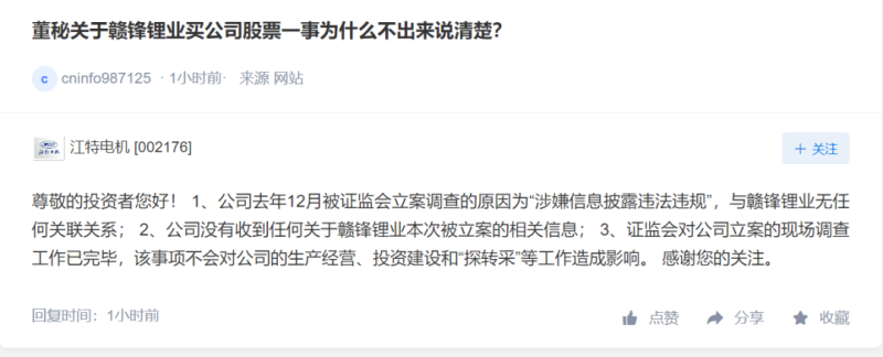 對此,江特電機(jī)7月4日早盤中在互動平臺表示,公司去年12月被證監(jiān)會立案調(diào)查的原因為“涉嫌信息披露違法違規(guī)”,與贛鋒鋰業(yè)無任何關(guān)聯(lián)關(guān)系;公司沒有收到任何關(guān)于贛鋒鋰業(yè)本次被立案的相關(guān)信息;證監(jiān)會對公司立案的現(xiàn)場調(diào)查工作已完畢,該事項不會對公司的生產(chǎn)經(jīng)營、投資建設(shè)和“探轉(zhuǎn)采”等工作造成影響。