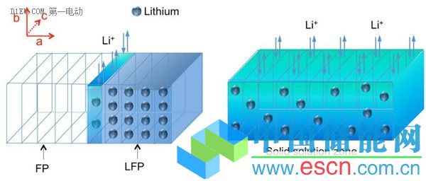 磷酸鐵鋰(LFP)電極充電或放電過程圖。由于鋰離子在充電過程中被分離,形成一個貧鋰磷酸鐵(FP)區(qū)域,但在兩者之間有一個固溶體區(qū)域(SSZ,暗藍綠色),這一區(qū)域包含有一些隨機分布的鋰原子,不同于鋰原子的原始結(jié)晶材料(淡藍色)中的有序數(shù)組。