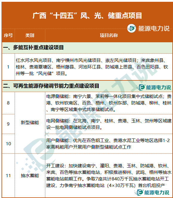 “十四五”期間,廣西將建設(shè)來賓象州縣、桂林、貴港覃塘區(qū)、梧州藤縣、河池環(huán)江縣、防城港上思縣、百色田陽縣、欽州等一批“風(fēng)光儲”項目。此外,新型儲能、抽水蓄能均明確了重點建設(shè)項目。