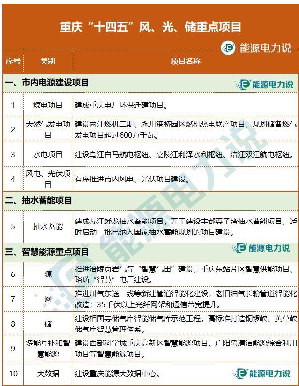 “十四五”期間,有序推進(jìn)市內(nèi)風(fēng)電、光伏項目建設(shè);建成綦江蟠龍抽水蓄能項目,開工建設(shè)豐都栗子灣抽水蓄能項目,適時啟動一批已納入國家抽水蓄能規(guī)劃的項目建設(shè);建設(shè)西部科學(xué)城重慶高新區(qū)智慧能源項目、廣陽島清潔能源綜合利用項目等智慧能源項目等。