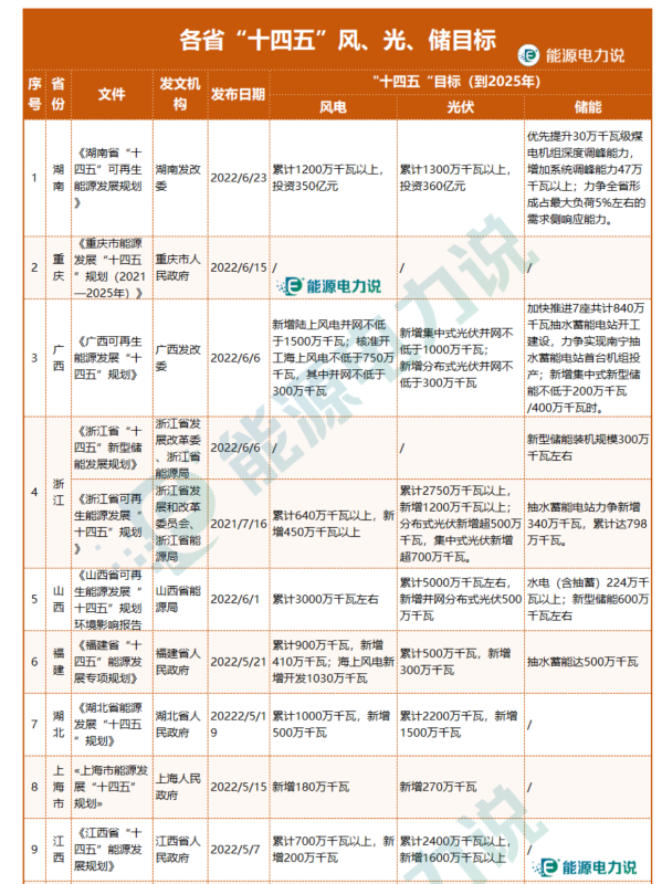 根據(jù)公開信息,能源電力說整理了湖南、重慶、廣西、廣東、浙江、山西等22省“十四五”風(fēng)、光、儲發(fā)展目標(biāo)及重點項目。