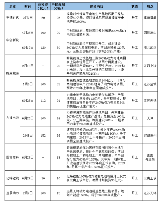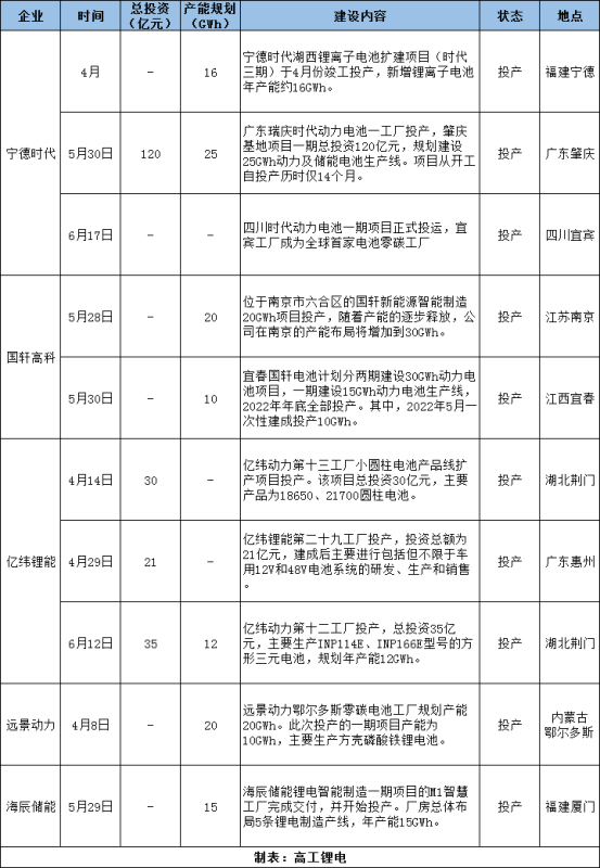 今年上半年,寧德時(shí)代湖西基地、肇慶基地、四川基地相繼投產(chǎn);國軒高科南京、宜春基地陸續(xù)投產(chǎn);億緯鋰能荊門、惠州等多個(gè)工廠也開始產(chǎn)能爬坡;遠(yuǎn)景動(dòng)力零碳電池工廠投產(chǎn)......