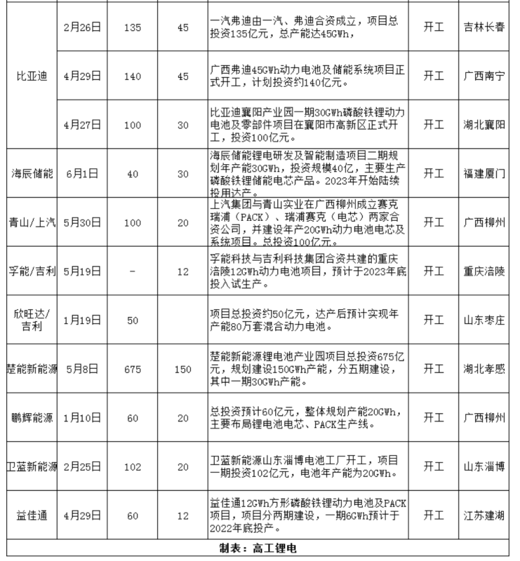 高工鋰電統(tǒng)計(jì)數(shù)據(jù)顯示,上半年動(dòng)力電池及儲(chǔ)能開工項(xiàng)目22個(gè),總產(chǎn)能規(guī)劃超638GWh。與上一輪開工潮相比,今年動(dòng)力電池企業(yè)同時(shí)啟動(dòng)多個(gè)基地同步建設(shè)。中創(chuàng)新航眉山、武漢基地,蜂巢能源上饒、鹽城基地,力神無錫、滁州、天津基地,比亞迪長(zhǎng)春、南寧、襄陽基地等均在短期內(nèi)陸續(xù)開工。