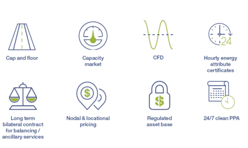 通常也稱為“定型購(gòu)電協(xié)議”、“可調(diào)度”或“全天候”購(gòu)電協(xié)議,這些是多年期合同,定義了可再生能源和柔性系統(tǒng)“混合”安裝的能源承購(gòu)價(jià)格?!叭旌颉毙g(shù)語(yǔ)是指資產(chǎn)向負(fù)荷提供與時(shí)間匹配的清潔電力的能力。清潔能源電力采購(gòu)協(xié)議有多種,這取決于消耗量與發(fā)電量的匹配程度(例如,80%的小時(shí)數(shù)與90%或100%的小時(shí)數(shù))。此類協(xié)議可通過(guò)公開(kāi)招標(biāo)或雙邊合同授予,也可適用于獨(dú)立部署的儲(chǔ)能系統(tǒng)。該工具提供了定價(jià)提升潛力和長(zhǎng)期收入確定性。為了使全天候清潔能源電力采購(gòu)協(xié)議鼓勵(lì)部署長(zhǎng)時(shí)儲(chǔ)能(LDES)等使能脫碳技術(shù),需要定義行業(yè)商定的質(zhì)量標(biāo)準(zhǔn)。