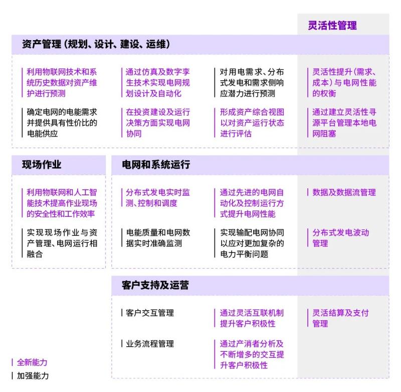 軟實力是價值實現(xiàn)的必要條件。在推動基礎(chǔ)要素升級的同時,電網(wǎng)企業(yè)需要著力打造駕馭新型電力系統(tǒng)的運營架構(gòu)和能力體系。埃森哲建議電網(wǎng)企業(yè)可以借助國際先進電網(wǎng)企業(yè)的運營能力框架,圍繞資產(chǎn)管理、現(xiàn)場作業(yè)、電網(wǎng)和系統(tǒng)運行、客戶支持及運營等領(lǐng)域多管齊下,系統(tǒng)分析并逐一梳理各項業(yè)務(wù)在新型電力系統(tǒng)建設(shè)要求下的提升方向和優(yōu)化需求。