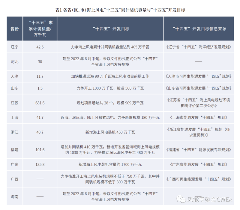 據統計,截至2022年6月中旬,我國共有9個?。▍^(qū)、市)通過文件形式公布或征求過“十四五”海上風電的具體發(fā)展規(guī)模相關意見。另有1個省份通過非正式下發(fā)文件的形式,透露自身的“十四五”海上風電發(fā)展規(guī)模。為方便讀者參考,本文對各?。▍^(qū)、市)“十四五”海上風電裝機規(guī)模的具體目標進行了整理與匯編。