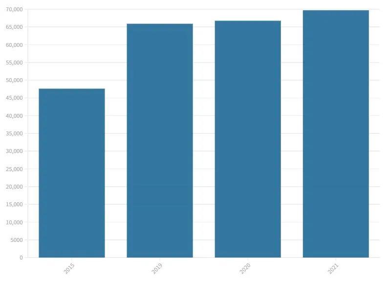 相比2020年的66749人增加了4.4%,與2019年的65904人相比增長了近4000人。