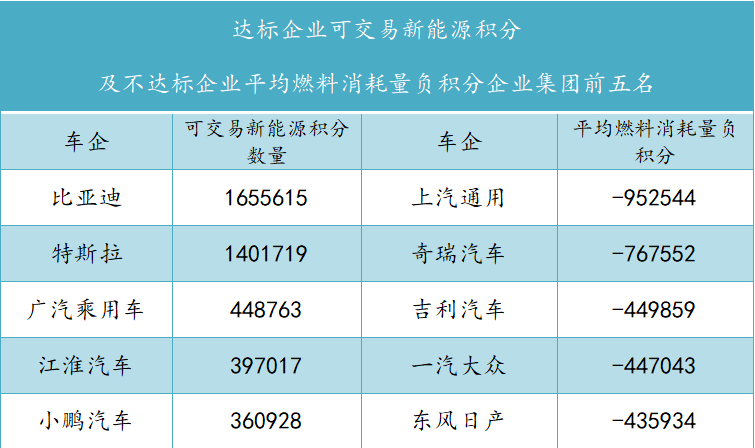 值得注意的是,達(dá)標(biāo)企業(yè)中可交易新能源積分?jǐn)?shù)量前五名的企業(yè)集團(tuán)分別為比亞迪(SZ002594,股價(jià)336.10元,市值9784億元)、特斯拉(TSLA,股價(jià)699.20美元,市值7244億美元)、廣汽乘用車、江淮汽車(SH600418,股價(jià)17.43元,市值380.67億元)和小鵬汽車(HK09868,股價(jià)125.60港元,市值2161億港元)。其中,比亞迪和特斯拉大幅領(lǐng)先其他車企,可交易的新能源積分?jǐn)?shù)量分別為165.6萬分和140.2萬分。