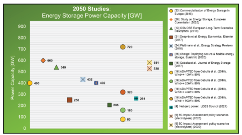 圖7 2050年不同研究報(bào)告中以歐洲為重點(diǎn)的儲(chǔ)能部署要求(GW)