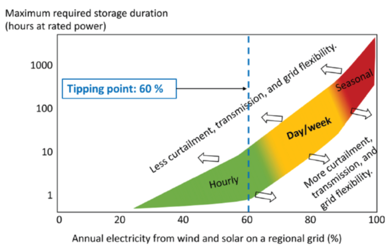 圖4:Y軸顯示了確保滿足需求所需最長(zhǎng)的儲(chǔ)能持續(xù)時(shí)間(對(duì)數(shù)標(biāo)度)與區(qū)域/地方層面的可再生能源發(fā)電設(shè)施(風(fēng)電和太陽能)的年度能源比例。箭頭表示限電、輸電和電網(wǎng)靈活性的保守(左側(cè))或激進(jìn)(右側(cè))的假設(shè)