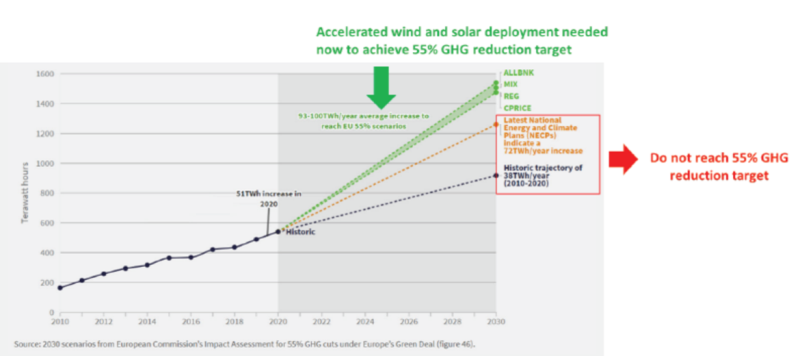 圖3 到2030年歐盟實(shí)現(xiàn)55%碳排放目標(biāo)所需增長(zhǎng)的風(fēng)力發(fā)電量和太陽能發(fā)電量