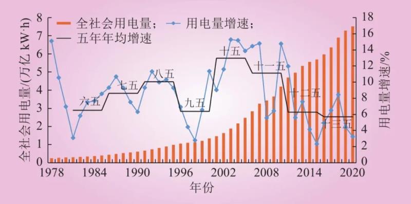 改革開放以來,中國全社會用電量保持快速增長,如圖1所示。1978—2020年,中國全社會用電量從0.25萬億kW·h增至7.5萬億kW·h,增長29倍,年均增長8.4%。其中,“六五”“七五”“八五”時期全社會用電量增速分別為6.5%、8.6%、10.0%,增速穩(wěn)步提升;“九五”時期,受亞洲金融危機等影響,全社會用電量增速回落至6.4%;“十五”“十一五”時期,受經濟高速增長拉動,全社會用電量實現兩位數增長,增速分別為13.0%、11.1%。
