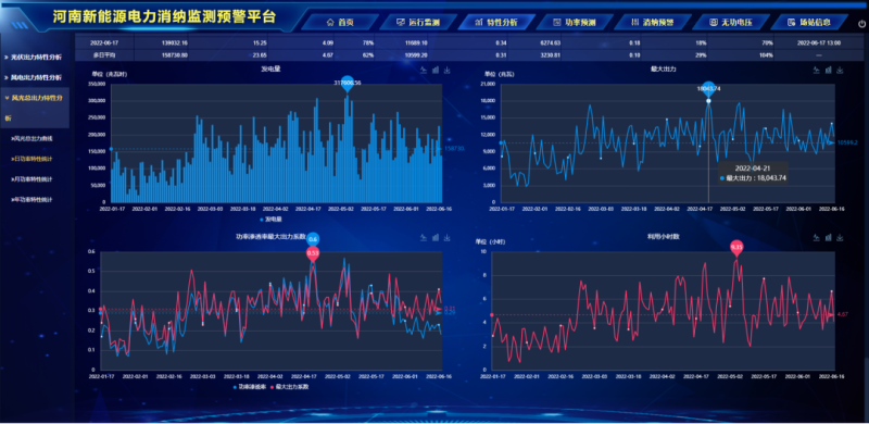 平臺(tái)特性分析模塊可實(shí)現(xiàn)風(fēng)光出力特性的年月日多時(shí)間尺度分析,且能實(shí)現(xiàn)省網(wǎng)、地市和場站三級(jí)聚合分析。重點(diǎn)對(duì)新能源發(fā)電量、最大出力、功率滲透率、利用小時(shí)數(shù)等關(guān)鍵指標(biāo)進(jìn)行量化分析,從多維度掌握河南電網(wǎng)新能源運(yùn)行特性。該平臺(tái)的功率預(yù)測部分可實(shí)現(xiàn)省市站風(fēng)光發(fā)電功率預(yù)測,并進(jìn)行誤差分析和評(píng)估,為省網(wǎng)和地市的新能源規(guī)劃運(yùn)行和火電開機(jī)方式等提供了指導(dǎo)作用。