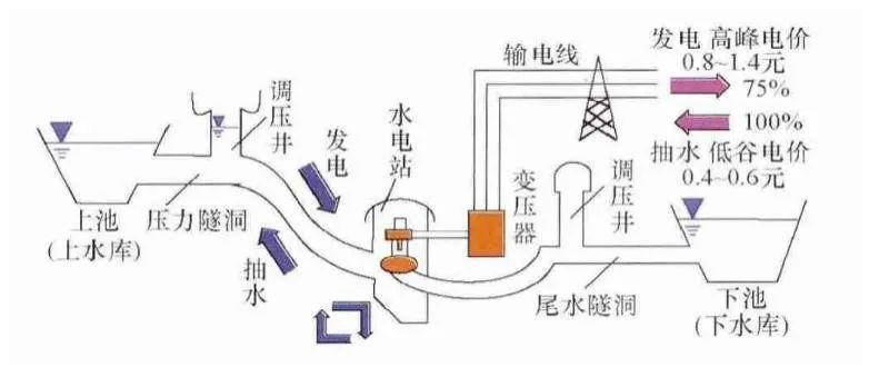 抽水蓄能的工作原理是利用可逆的水泵水輪機(jī)組,在電力負(fù)荷低谷時(shí)利用多余電能將下水庫中的水抽到上水庫儲(chǔ)存起來,在電力負(fù)荷高峰時(shí)放水發(fā)電。抽水蓄能電站由上下水庫、引水系統(tǒng)(高壓部分和低壓部分)、電站廠房和機(jī)組等構(gòu)成。理論來說,水量和落差越大,儲(chǔ)能就越多。