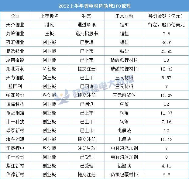 據(jù)起點鋰電大數(shù)據(jù)不完全統(tǒng)計,2022上半年,在鋰電材料領(lǐng)域,共有18家企業(yè)加速沖刺IPO,涉足領(lǐng)域包括鋰/鈷鹽、正極材料、電解液、銅箔、鋁塑膜等,募資金額超250億元,鋰電材料企業(yè)也成為當(dāng)下鋰電行業(yè)IPO隊列的主力軍。