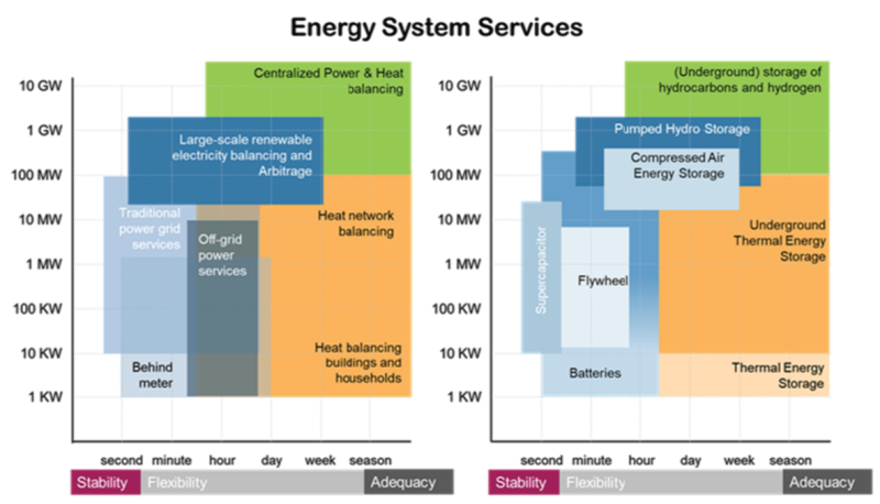 圖8 根據(jù)功率(W)和充電和放電的相關(guān)時(shí)間尺度映射的電力系統(tǒng)服務(wù)和儲(chǔ)能選項(xiàng)。顏色表示儲(chǔ)能技術(shù)在哪個(gè)能源系統(tǒng)中實(shí)施:藍(lán)色為電網(wǎng),綠色為天然氣發(fā)電設(shè)施;橙色為熱儲(chǔ)能。