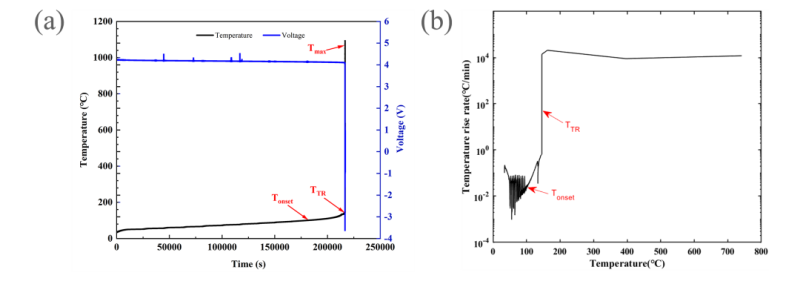 圖2 190Ah電池?zé)崾Э?a)溫升/電壓-時(shí)間曲線和(b)溫升速率-溫度曲線
