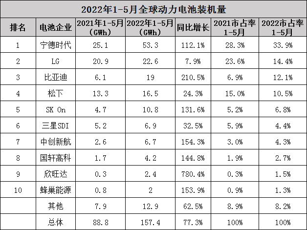 數(shù)據(jù)顯示,2022年1-5月全球動力電池裝機(jī)量為157.4GWh,其中,寧德時代穩(wěn)居榜單冠軍,1-5月動力電池裝機(jī)量53.3GWh。特別值得注意的是,5月,寧德時代市占率34%,是韓國LG、SK、三星以及日本松下四家企業(yè)市占率的總和。