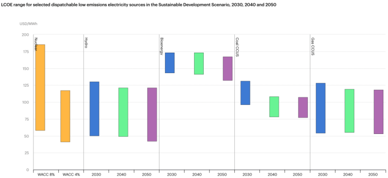 核電要發(fā)揮更大的作用,將需要建設(shè)成本大幅下降。核電的建設(shè)成本需要降至2000-3000美元/千瓦(以2020年美元計),才能保持競爭力。根據(jù)不同的融資成本,將對應(yīng)40-80美元/兆瓦時的核電平準(zhǔn)成本,包括退役和核廢料處理。