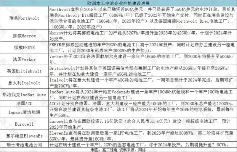 一個(gè)明顯的變化是,進(jìn)入2022年以來,包括瑞典Northvolt、法國(guó)Verkor、法國(guó)ACC、斯洛伐克InoBat Auto、英國(guó)Britishvolt、挪威Freyr、挪威Morrow、意大利Italvolt、塞爾維亞ElevenEs等多家歐洲本土電池企業(yè),都更新了其動(dòng)力電池工廠建設(shè)計(jì)劃,建設(shè)進(jìn)度明顯提速。