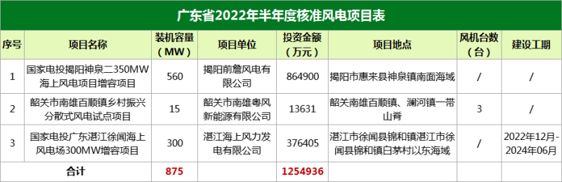 廣東核準(zhǔn)3個(gè)風(fēng)電項(xiàng)目,總規(guī)模875MW,總投資1254936萬元。