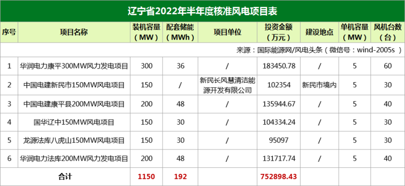 遼寧核準(zhǔn)6個(gè)風(fēng)電項(xiàng)目,總規(guī)模1150MW,配套儲(chǔ)能192MWh,總投資752898.43萬元。