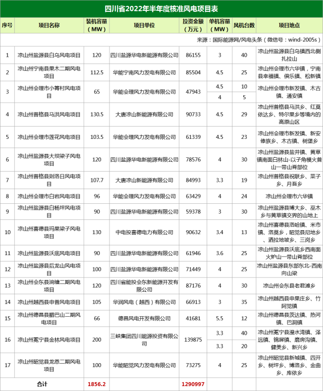 四川核準(zhǔn)17個(gè)風(fēng)電項(xiàng)目,總規(guī)模1856.2MW,總投資1290997萬元。