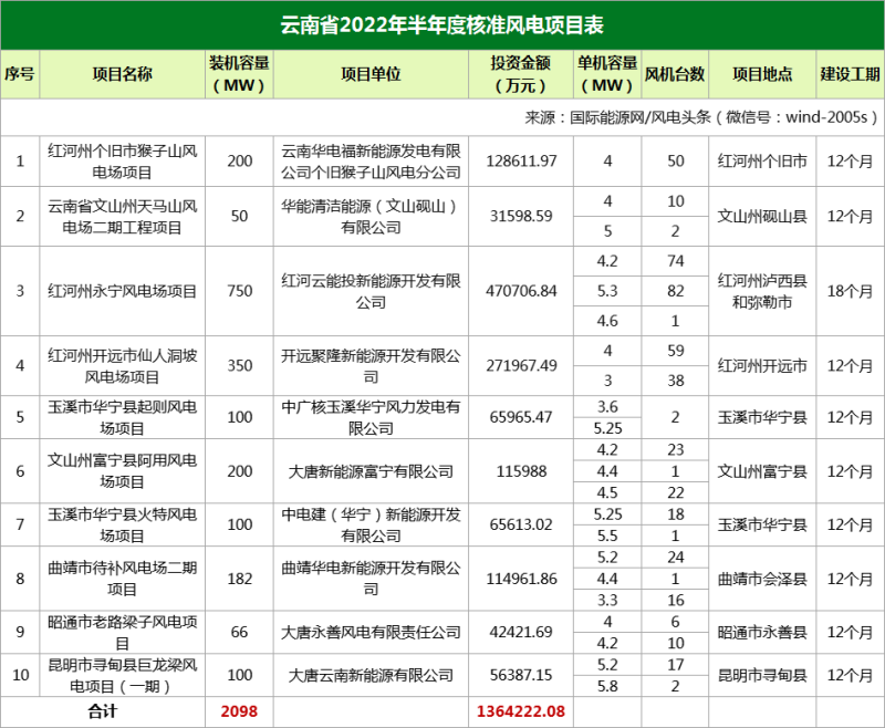 云南核準(zhǔn)10個(gè)風(fēng)電項(xiàng)目,總規(guī)模2098MW,總投資1364222.08萬元。