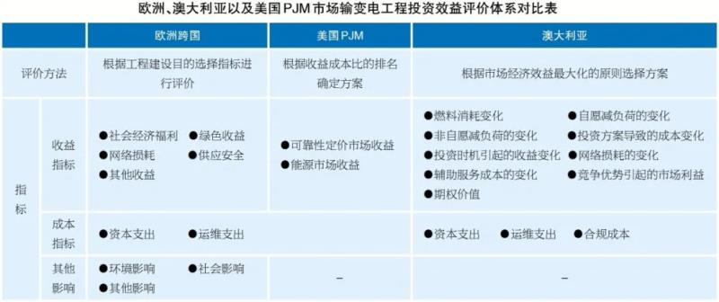 通過(guò)對(duì)國(guó)際實(shí)踐進(jìn)行梳理總結(jié),歐洲、澳大利亞以及美國(guó)PJM市場(chǎng)的輸變電工程投資效益評(píng)價(jià)方法和評(píng)價(jià)指標(biāo)體系如下表所示: