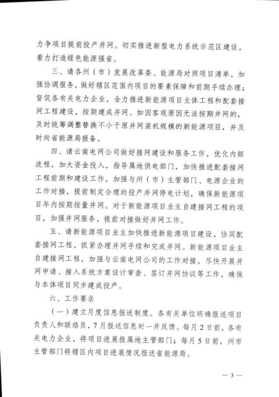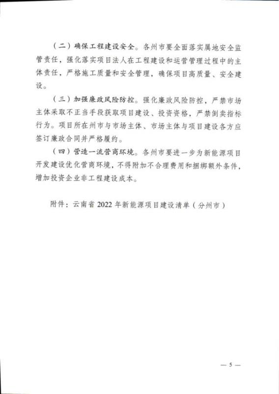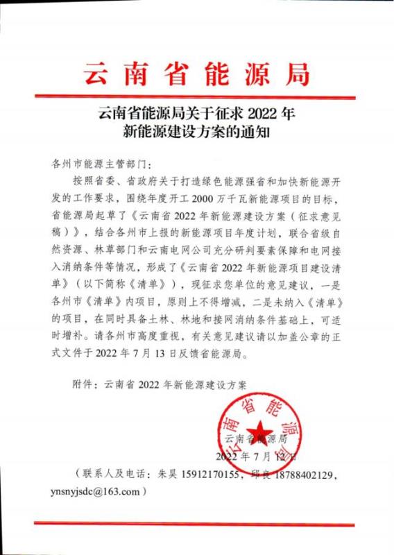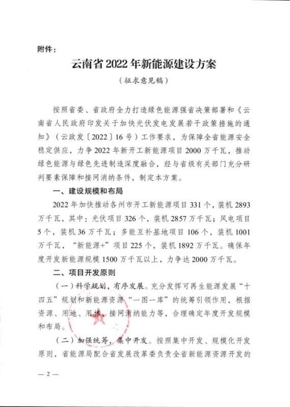 同日,云南省能源局還發(fā)布了《關于征求2022年新能源建設方案的通知》。方案,2022年云南將加快推動各州市開工新能源項目331個,裝機2893萬千瓦,其中:光伏項目326個,裝機2857萬千瓦;風電項目5個,裝機36萬千瓦;多能互補基地項目106個,裝機1001萬千瓦,“新能源+”項目225個,裝機1892萬千瓦。確保年度開發(fā)新能源規(guī)模1500萬千瓦以上,力爭達2000萬千瓦。