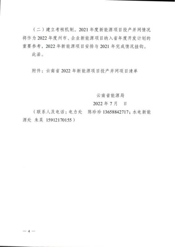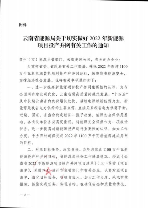 中國儲能網(wǎng)訊:7月13日,云南省能源局發(fā)布《關于征求2022年新能源項目投產(chǎn)并網(wǎng)有關意見建議的函》。根據(jù)《關于征求2022年新能源項目投產(chǎn)并網(wǎng)有關意見建議的函》,確保2022年新增1100萬千瓦新能源裝機順利投產(chǎn)和并網(wǎng)運行。
