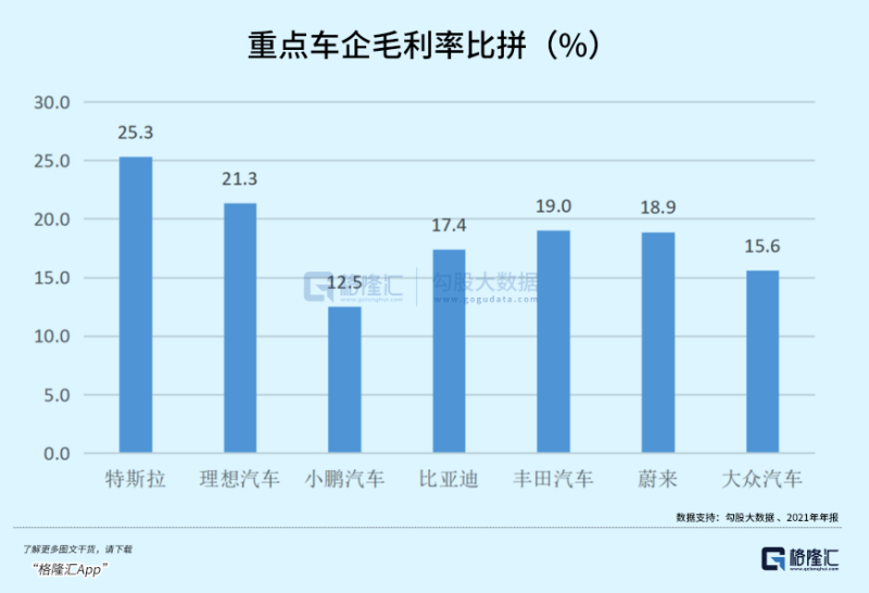 先來對照一下特斯拉等幾家重要的車企的毛利率。