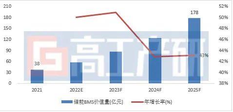 2021-2025年中國儲(chǔ)能BMS市場規(guī)模及預(yù)測(億元,%)
