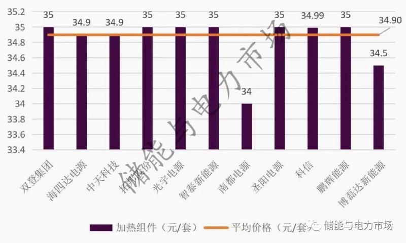 另外,加熱組件的報價區(qū)間為34~35元/套,按前8名中標(biāo)候選人所占份額計算其平均價格為34.9元/套。其中,雙登集團(tuán)、拓邦股份、光宇電源、智泰新能源、圣陽電源、鵬輝能源均報價35元/套,而南都電源報價最低,為34元/套。