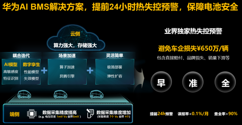 其次,華為AI BMS云端電池管理系統(tǒng),通過AI模型和數(shù)字孿生耦合迭代升級,打造專屬的自學習自優(yōu)化人工智能算法,可提前24小時預警電池熱失控風險,風險預警的查全率可高達90%,誤報率可低至0.1%/月。