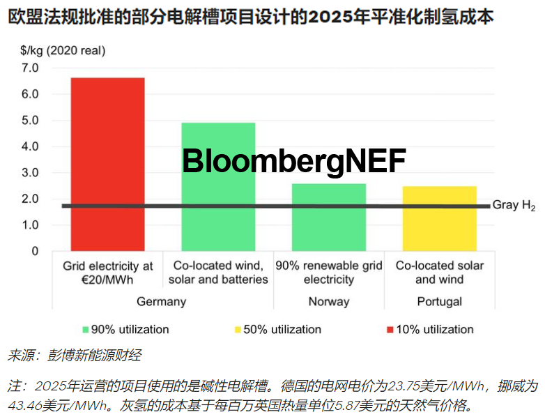 擬議規(guī)定青睞可再生能源占比較高地區(qū)的氫項目。由于挪威的電網(wǎng)中可再生能源占比高達90%,因此并網(wǎng)電解槽可能符合綠色標準,并在2025年實現(xiàn)2.58美元/千克的平準化制氫成本,同時確保穩(wěn)定的產(chǎn)量。然而,在大多數(shù)歐盟國家,根據(jù)歐盟的定義,風光共址作為電力來源將獲得優(yōu)先地位。葡萄牙風光共址生產(chǎn)的氫成本可能比挪威的并網(wǎng)項目低4%,但利用率只有50%。